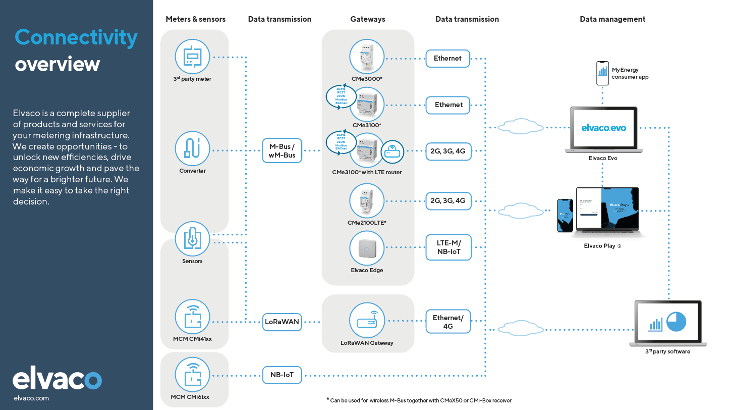 Elvaco offers products for each metering project - from Gateways, communication modules and meters to software solutions including Elvaco EVO, the cloud-based system for data and device management.